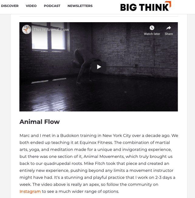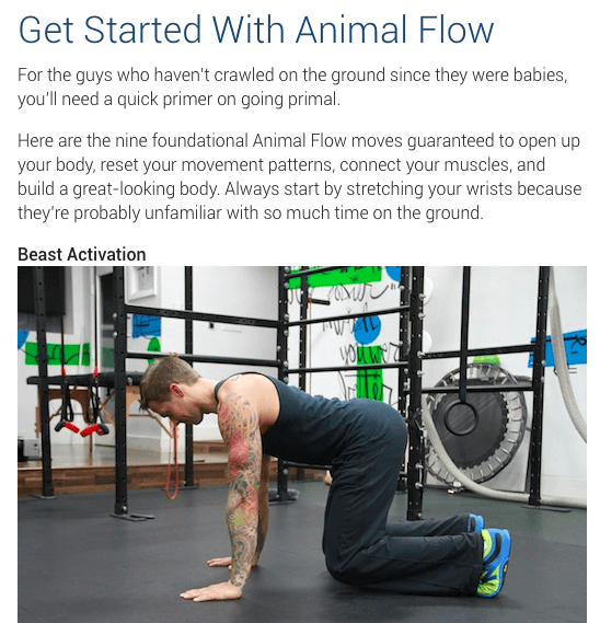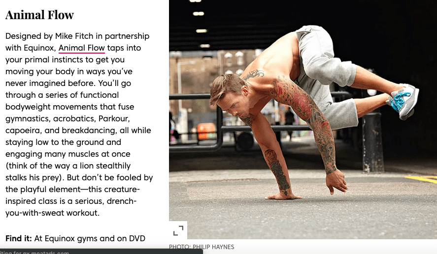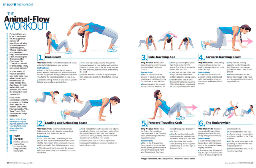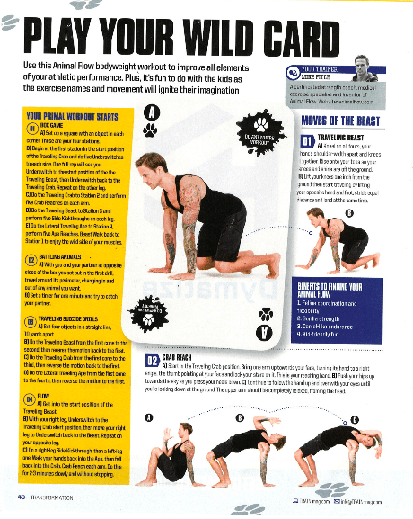 “Want to build strength, in-crease mobility and balance, and boost your endurance? Tap into your inner animal. That’s the idea behind Animal Flow, a dynamic body-weight workout system that gives new meaning to the phrase “beast mode.”"