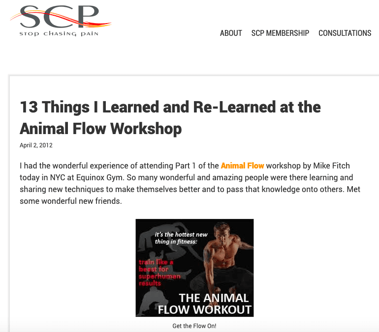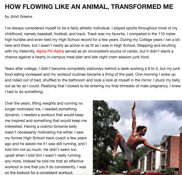 "I was really captivated by workouts that incorporated pushups, fluidity, legs and flexibility. Basically, if I could develop the perfect workout, I would study the moves of a ninja and the moves of a panther. I started searching for different bodyweight exercises on YouTube and I came across this guy teaching this workout called Animal Flow. This guy was impressive, his movements are so smooth, yet incredibly strong. His name is Mike Fitch. His company is called Global Bodyweight Training and he created this Animal Flow. The best way to describe Animal Flow: it’s a series of movements and bodyweight exercises created to flow. It also incorporated some static holds and b-boy/break dance moves. Let me be the first to tell you…it is not for the faint of heart."