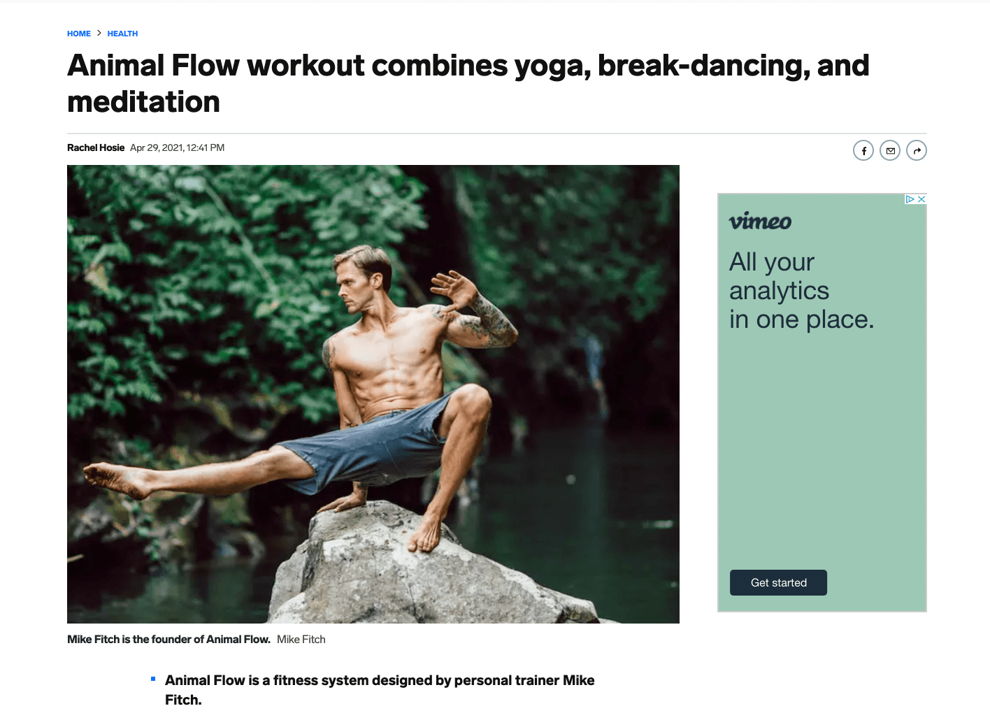 In the segment entitled, “See how the ‘Animal Flow’ Workout is Shaking Up the Fitness Industry,” Mike discussed Animal Flow and how this workout builds strength and endurance. Mike stated “Animal flow is a ground based, movement program that’s designed to connect our bodies to ourselves, our minds to our bodies through the floor. One of the ways that we found that’s really beneficial in doing that is by placing hands and feet in contact with the ground and moving around. It’s really about improving the connection, communication and function of the human animals.”