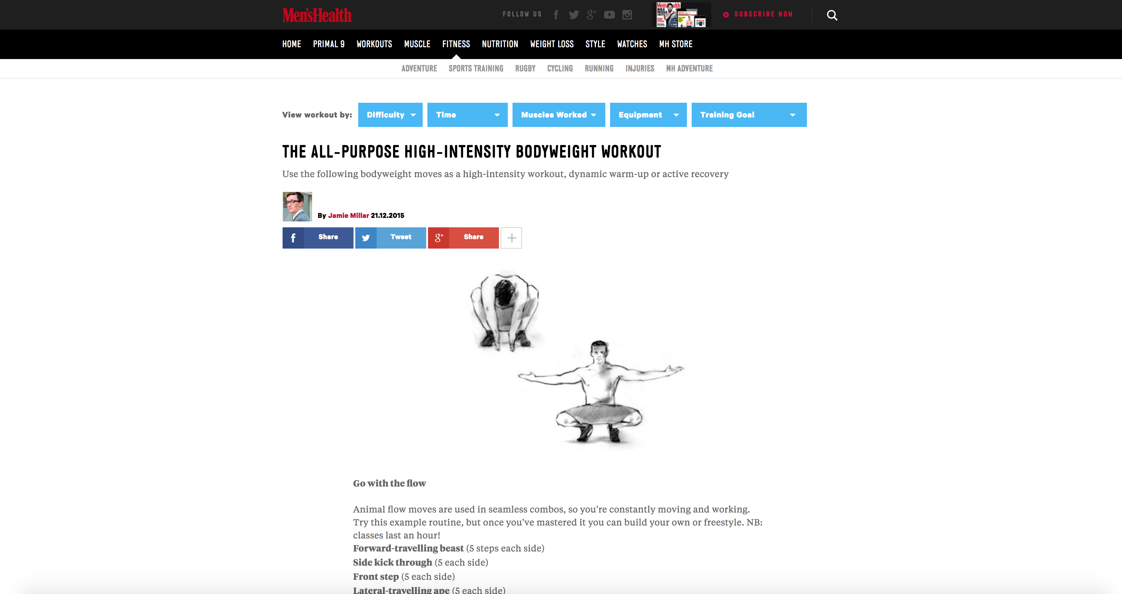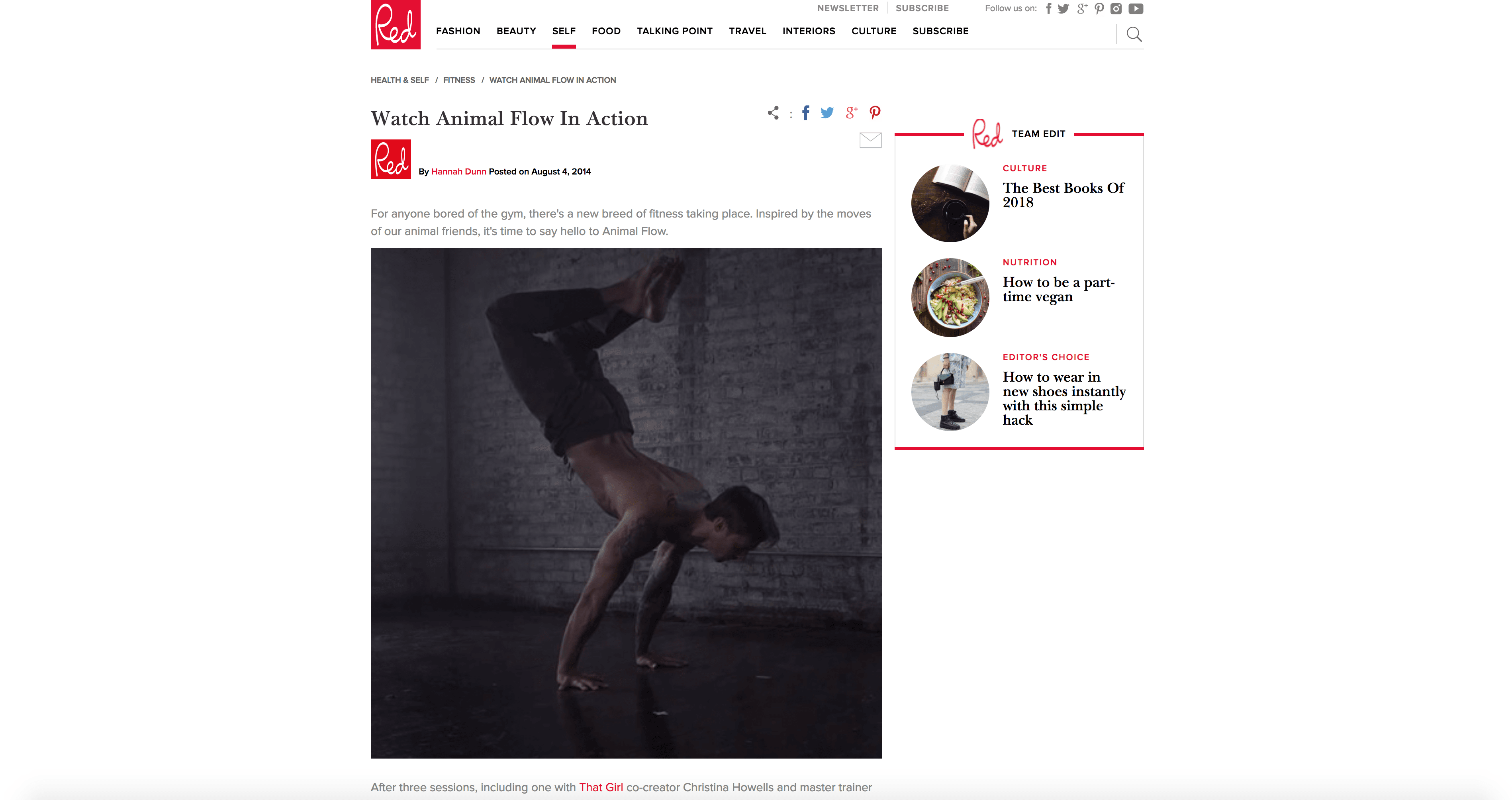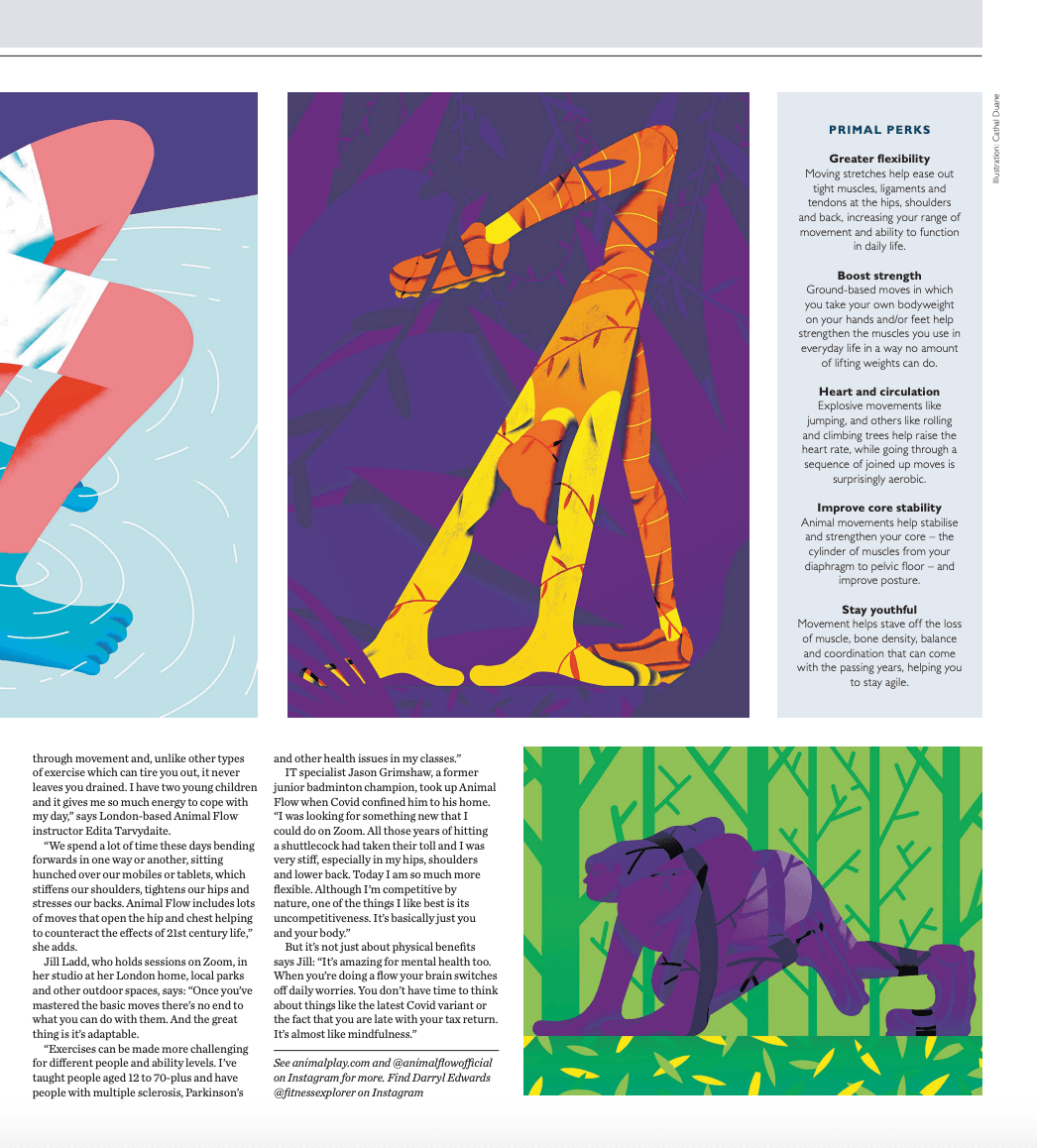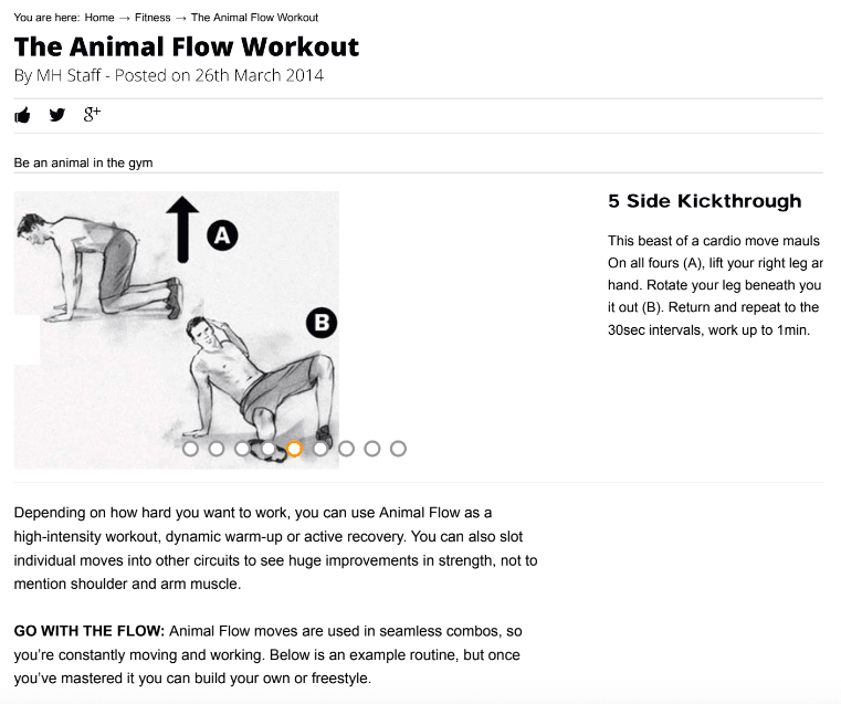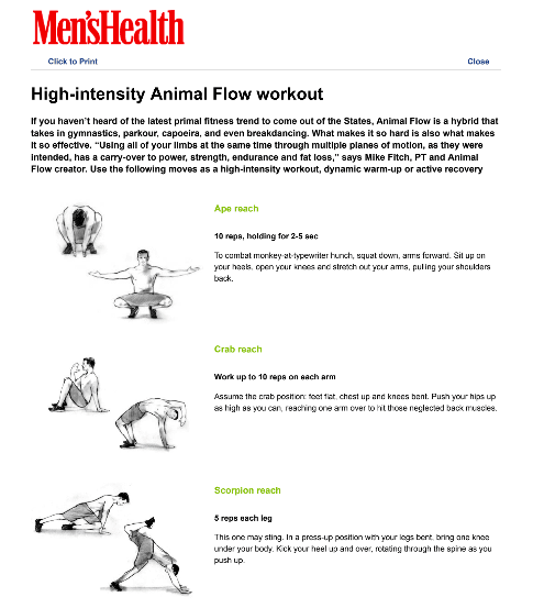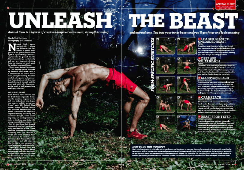 “That’s where Animal Flow comes in. This training system, invented by American coach Mike Fitch, is a combination of animal movement, strength training, martial arts, and gymnastics. Mastering these arts requires beastly levels of strength, and the grace and agility of a freerunnner, so the result is both eye-catching and highly effective.”