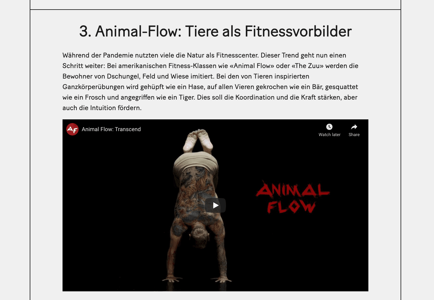 Während der Pandemie nutzten viele die Natur als Fitnesscenter. Dieser Trend geht nun einen Schritt weiter: Bei amerikanischen Fitness-Klassen wie «Animal Flow» oder «The Zuu» werden die Bewohner von Dschungel, Feld und Wiese imitiert. Bei den von Tieren inspirierten Ganzkörperübungen wird gehüpft wie ein Hase, auf allen Vieren gekrochen wie ein Bär, gesquattet wie ein Frosch und angegriffen wie ein Tiger. Dies soll die Koordination und die Kraft stärken, aber auch die Intuition fördern.