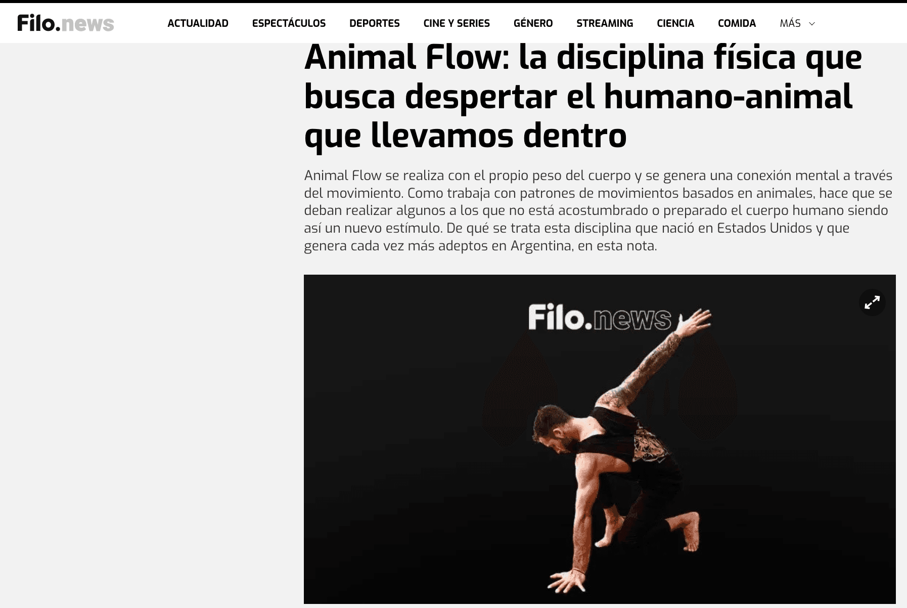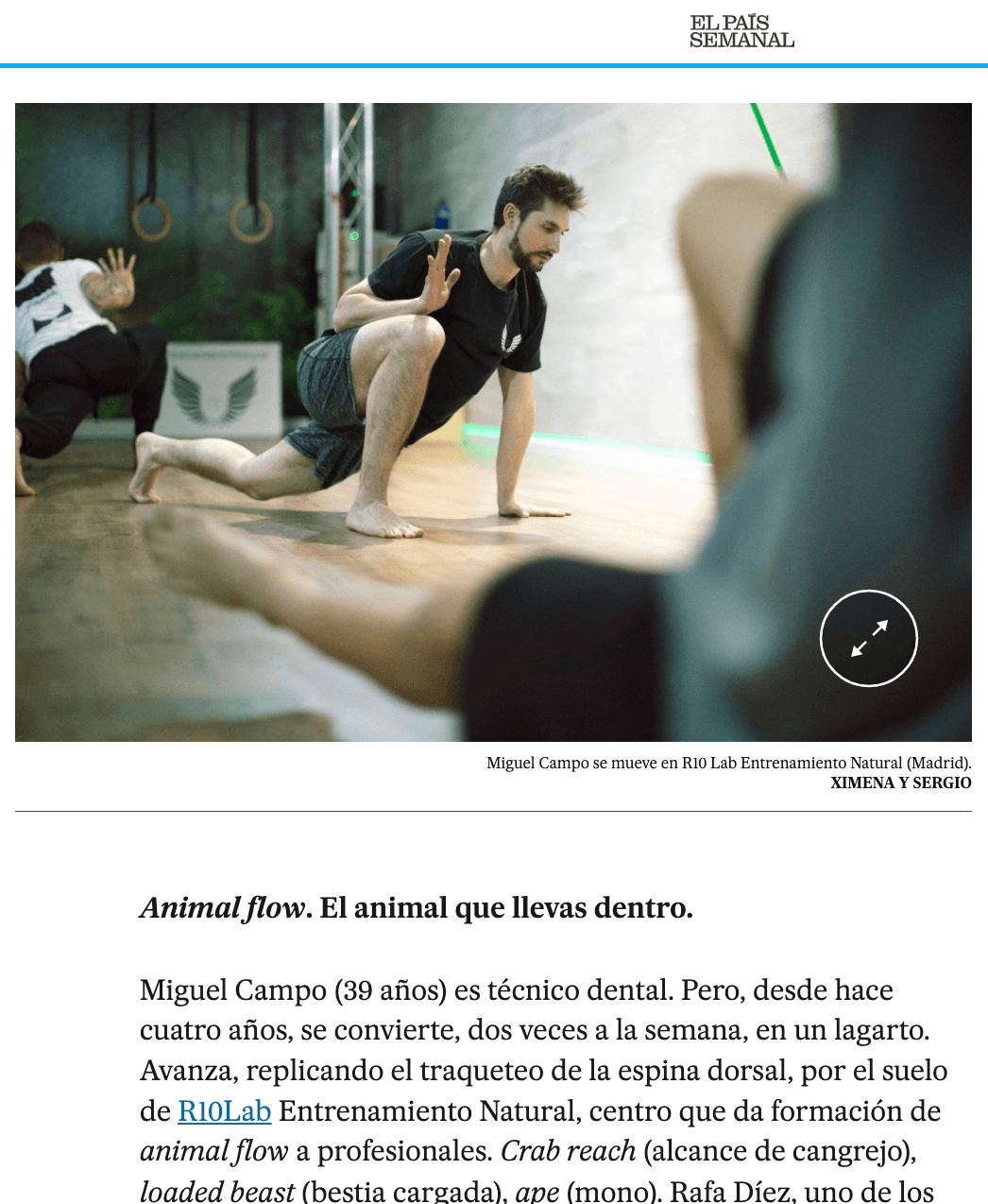 Animal flow. El animal que llevas dentro.Miguel Campo (39 años) es técnico dental. Pero, desde hace cuatro años, se convierte, dos veces a la semana, en un lagarto. Avanza, replicando el traqueteo de la espina dorsal, por el suelo de R10Lab Entrenamiento Natural, centro que da formación de animal flow a profesionales. Crab reach (alcance de cangrejo), loaded beast (bestia cargada), ape (mono). Rafa Díez, uno de los nueve maestros instructores de esta disciplina en el mundo, dicta animales y los alumnos sincronizan una coreografía. “La clave es el control corporal para saber hacia dónde, cómo y por qué me muevo”, resume.