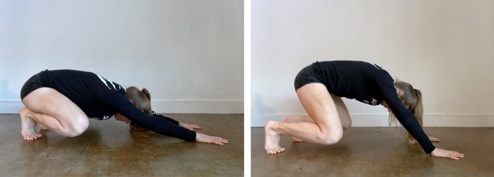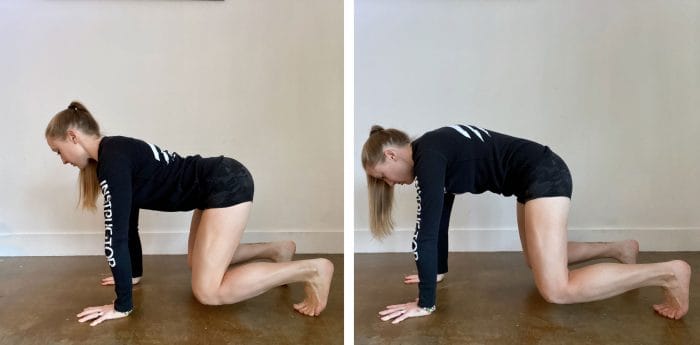 In Loaded Beast, mobility through shoulders, hips and spine allows for a long and low position (left). Altered mobility due to low back pain could result in unwanted ‘guarding’ and incorrect alignment (right).