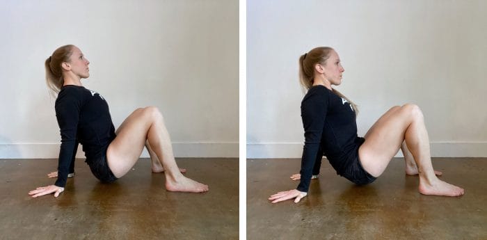Ideal Crab alignment (left) looks for a long spine and open chest. Unwanted low back flexion or restriction through chest or shoulders (right) might be present if you experience LBP.