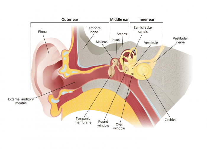 Anatomy of the inner, middle and outer ear, including parts of the vestibular system.