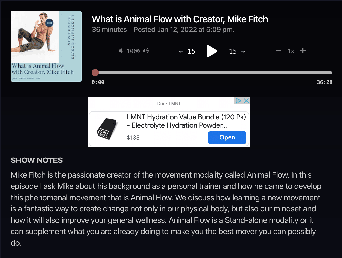 In the episode entitled, “WORKOUT WEDNESDAY Mike Fitch – Animal Flow, Dr. Dan Engle – Transformational Medicine #1637,” Mike discussed Animal Flow and why it’s a great workout to try in the new year. Mike stated, “It truly is all about how we inhabit our human animal vessels and move them through space and one of the great ways I found to be able to do that successfully is by putting hands and feet in contact with the ground and moving around.”